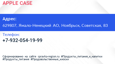APPLE CASE по адресу 629807, Ямало-Ненецкий АО, Ноябрьск, Советская, 83 в дальнейшем Организация, размещена в следующих категориях: