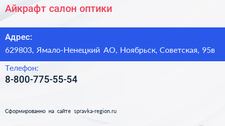 Айкрафт, салон оптики по адресу 629803, Ямало-Ненецкий АО, Ноябрьск, Советская, 95в в дальнейшем Организация, размещена в следующих категориях: