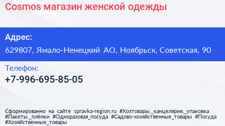 Cosmos, магазин женской одежды по адресу 629807, Ямало-Ненецкий АО, Ноябрьск, Советская, 90 в дальнейшем Организация, размещена в следующих категориях:
