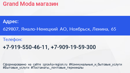 Grand Moda, магазин по адресу 629807, Ямало-Ненецкий АО, Ноябрьск, Ленина, 65 в дальнейшем Организация, размещена в следующих категориях: