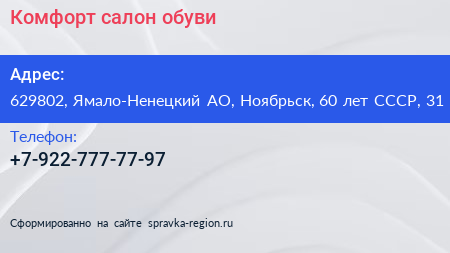 Комфорт, салон обуви по адресу 629802, Ямало-Ненецкий АО, Ноябрьск, 60 лет СССР, 31 в дальнейшем Организация, размещена в следующих категориях: