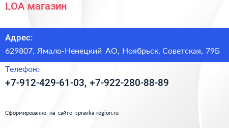 LOA, магазин по адресу 629807, Ямало-Ненецкий АО, Ноябрьск, Советская, 79Б в дальнейшем Организация, размещена в следующих категориях: