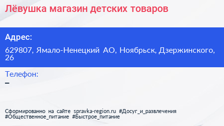 Лёвушка, магазин детских товаров по адресу 629807, Ямало-Ненецкий АО, Ноябрьск, Дзержинского, 26 в дальнейшем Организация, размещена в следующих категориях:
