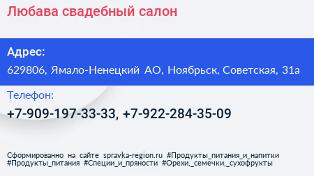 Любава, свадебный салон по адресу 629806, Ямало-Ненецкий АО, Ноябрьск, Советская, 31а в дальнейшем Организация, размещена в следующих категориях:
