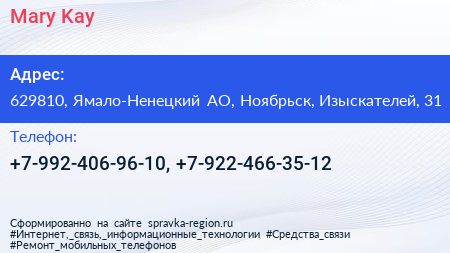 Mary Kay по адресу 629810, Ямало-Ненецкий АО, Ноябрьск, Изыскателей, 31 в дальнейшем Организация, размещена в следующих категориях: