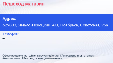 Пешеход, магазин по адресу 629803, Ямало-Ненецкий АО, Ноябрьск, Советская, 95а в дальнейшем Организация, размещена в следующих категориях: