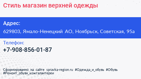 Стиль, магазин верхней одежды по адресу 629803, Ямало-Ненецкий АО, Ноябрьск, Советская, 95а в дальнейшем Организация, размещена в следующих категориях: