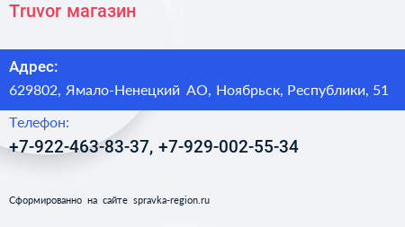 Truvor, магазин по адресу 629802, Ямало-Ненецкий АО, Ноябрьск, Республики, 51 в дальнейшем Организация, размещена в следующих категориях: