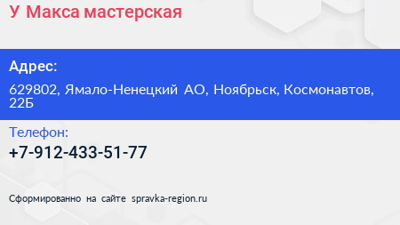 У Макса, мастерская по адресу 629802, Ямало-Ненецкий АО, Ноябрьск, Космонавтов, 22Б в дальнейшем Организация, размещена в следующих категориях: