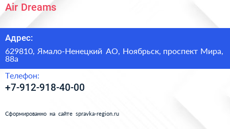 Air Dreams по адресу 629810, Ямало-Ненецкий АО, Ноябрьск, проспект Мира, 88а в дальнейшем Организация, размещена в следующих категориях: