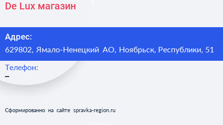 De Lux, магазин по адресу 629802, Ямало-Ненецкий АО, Ноябрьск, Республики, 51 в дальнейшем Организация, размещена в следующих категориях: