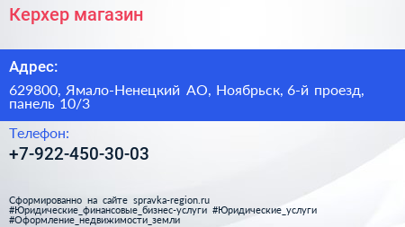 Керхер, магазин по адресу 629800, Ямало-Ненецкий АО, Ноябрьск, 6-й проезд, панель 10/3 в дальнейшем Организация, размещена в следующих категориях: