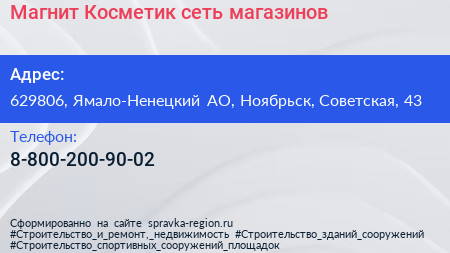 Магнит Косметик, сеть магазинов по адресу 629806, Ямало-Ненецкий АО, Ноябрьск, Советская, 43 в дальнейшем Организация, размещена в следующих категориях: