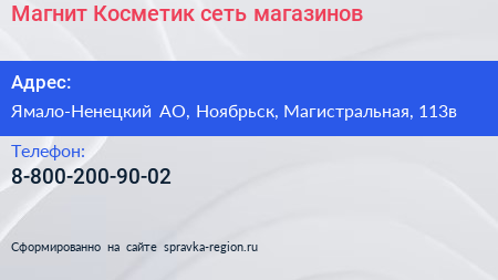 Магнит Косметик, сеть магазинов по адресу Ямало-Ненецкий АО, Ноябрьск, Магистральная, 113в в дальнейшем Организация, размещена в следующих категориях: