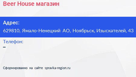 Beer House, магазин по адресу 629810, Ямало-Ненецкий АО, Ноябрьск, Изыскателей, 43 в дальнейшем Организация, размещена в следующих категориях: