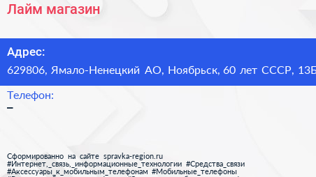 Лайм, магазин по адресу 629806, Ямало-Ненецкий АО, Ноябрьск, 60 лет СССР, 13Б в дальнейшем Организация, размещена в следующих категориях: