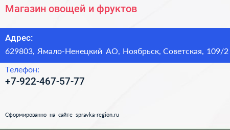 Магазин овощей и фруктов по адресу 629803, Ямало-Ненецкий АО, Ноябрьск, Советская, 109/2 в дальнейшем Организация, размещена в следующих категориях: