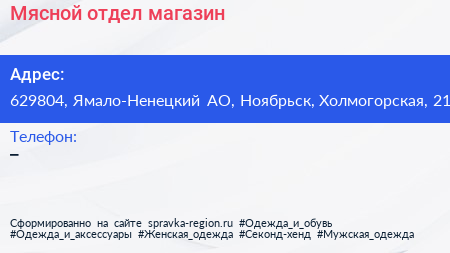 Мясной отдел, магазин по адресу 629804, Ямало-Ненецкий АО, Ноябрьск, Холмогорская, 21 в дальнейшем Организация, размещена в следующих категориях: