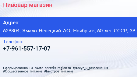 Пивовар, магазин по адресу 629804, Ямало-Ненецкий АО, Ноябрьск, 60 лет СССР, 39 в дальнейшем Организация, размещена в следующих категориях: