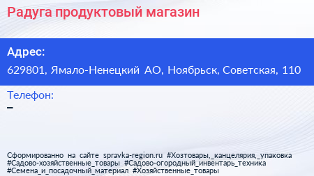 Радуга, продуктовый магазин по адресу 629801, Ямало-Ненецкий АО, Ноябрьск, Советская, 110 в дальнейшем Организация, размещена в следующих категориях:
