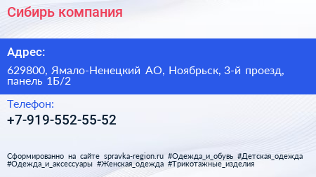 Сибирь, компания по адресу 629800, Ямало-Ненецкий АО, Ноябрьск, 3-й проезд, панель 1Б/2 в дальнейшем Организация, размещена в следующих категориях:
