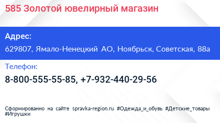 585 Золотой, ювелирный магазин по адресу 629807, Ямало-Ненецкий АО, Ноябрьск, Советская, 88а в дальнейшем Организация, размещена в следующих категориях: