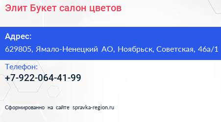 Элит Букет, салон цветов по адресу 629805, Ямало-Ненецкий АО, Ноябрьск, Советская, 46а/1 в дальнейшем Организация, размещена в следующих категориях: