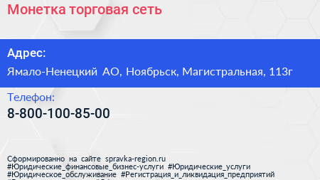 Монетка, торговая сеть по адресу Ямало-Ненецкий АО, Ноябрьск, Магистральная, 113г в дальнейшем Организация, размещена в следующих категориях: