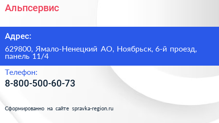 Альпсервис по адресу 629800, Ямало-Ненецкий АО, Ноябрьск, 6-й проезд, панель 11/4 в дальнейшем Организация, размещена в следующих категориях: