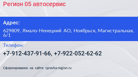 Регион 05, автосервис по адресу 629809, Ямало-Ненецкий АО, Ноябрьск, Магистральная, 6/1 в дальнейшем Организация, размещена в следующих категориях:
