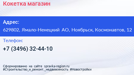 Кокетка, магазин по адресу 629802, Ямало-Ненецкий АО, Ноябрьск, Космонавтов, 12 в дальнейшем Организация, размещена в следующих категориях: