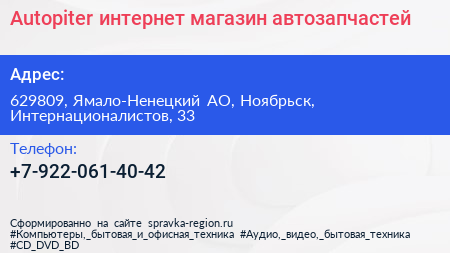 Autopiter, интернет-магазин автозапчастей по адресу 629809, Ямало-Ненецкий АО, Ноябрьск, Интернационалистов, 33 в дальнейшем Организация, размещена в следующих категориях: