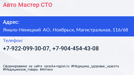Авто Мастер, СТО по адресу Ямало-Ненецкий АО, Ноябрьск, Магистральная, 116/68 в дальнейшем Организация, размещена в следующих категориях: