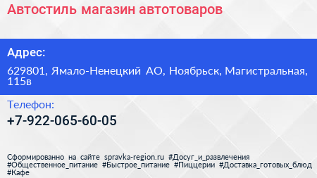Автостиль, магазин автотоваров по адресу 629801, Ямало-Ненецкий АО, Ноябрьск, Магистральная, 115в в дальнейшем Организация, размещена в следующих категориях: