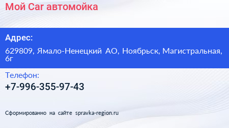 Мой Car, автомойка по адресу 629809, Ямало-Ненецкий АО, Ноябрьск, Магистральная, 6г в дальнейшем Организация, размещена в следующих категориях:
