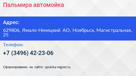 Пальмира, автомойка по адресу 629806, Ямало-Ненецкий АО, Ноябрьск, Магистральная, 25 в дальнейшем Организация, размещена в следующих категориях:
