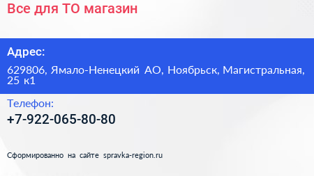Все для ТО, магазин по адресу 629806, Ямало-Ненецкий АО, Ноябрьск, Магистральная, 25 к1 в дальнейшем Организация, размещена в следующих категориях: