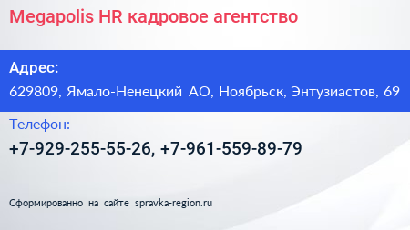 Megapolis HR, кадровое агентство по адресу 629809, Ямало-Ненецкий АО, Ноябрьск, Энтузиастов, 69 в дальнейшем Организация, размещена в следующих категориях: