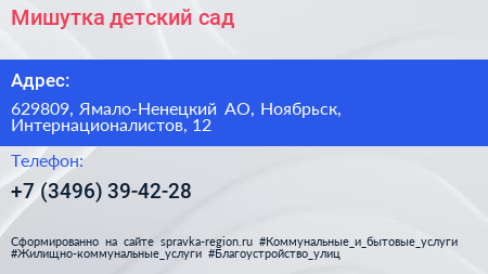 Мишутка, детский сад по адресу 629809, Ямало-Ненецкий АО, Ноябрьск, Интернационалистов, 12 в дальнейшем Организация, размещена в следующих категориях: