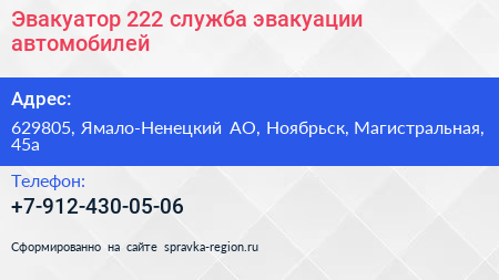 Эвакуатор 222, служба эвакуации автомобилей по адресу 629805, Ямало-Ненецкий АО, Ноябрьск, Магистральная, 45а в дальнейшем Организация, размещена в следующих категориях: