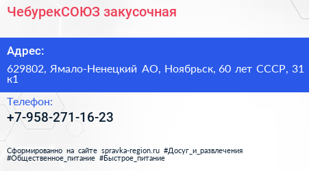 ЧебурекСОЮЗ, закусочная по адресу 629802, Ямало-Ненецкий АО, Ноябрьск, 60 лет СССР, 31 к1 в дальнейшем Организация, размещена в следующих категориях: