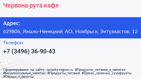 Червона рута, кафе по адресу 629806, Ямало-Ненецкий АО, Ноябрьск, Энтузиастов, 12 в дальнейшем Организация, размещена в следующих категориях: