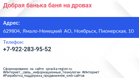 Добрая банька, баня на дровах по адресу 629804, Ямало-Ненецкий АО, Ноябрьск, Пионерская, 10 в дальнейшем Организация, размещена в следующих категориях: