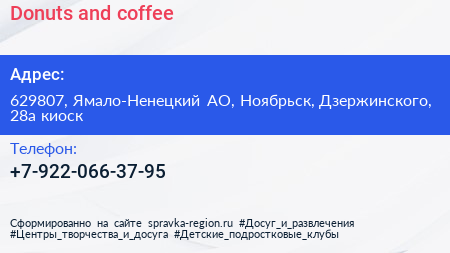 Donuts and coffee по адресу 629807, Ямало-Ненецкий АО, Ноябрьск, Дзержинского, 28а киоск в дальнейшем Организация, размещена в следующих категориях: