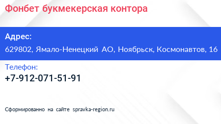 Фонбет, букмекерская контора по адресу 629802, Ямало-Ненецкий АО, Ноябрьск, Космонавтов, 16 в дальнейшем Организация, размещена в следующих категориях: