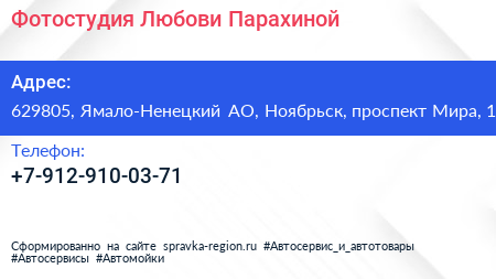 Фотостудия Любови Парахиной по адресу 629805, Ямало-Ненецкий АО, Ноябрьск, проспект Мира, 1 в дальнейшем Организация, размещена в следующих категориях: