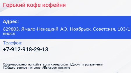 Горький кофе, кофейня по адресу 629803, Ямало-Ненецкий АО, Ноябрьск, Советская, 103/1 киоск в дальнейшем Организация, размещена в следующих категориях: