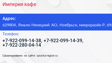 Империя, кафе по адресу 629804, Ямало-Ненецкий АО, Ноябрьск, микрораойн Р, 69а в дальнейшем Организация, размещена в следующих категориях: