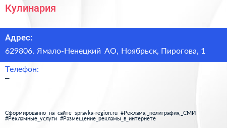 Кулинария по адресу 629806, Ямало-Ненецкий АО, Ноябрьск, Пирогова, 1 в дальнейшем Организация, размещена в следующих категориях: