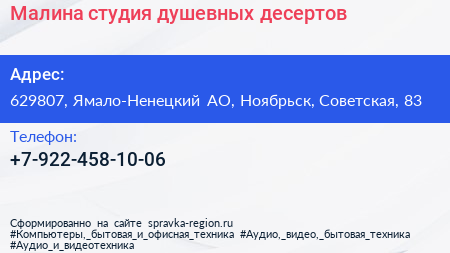 Малина, студия душевных десертов по адресу 629807, Ямало-Ненецкий АО, Ноябрьск, Советская, 83 в дальнейшем Организация, размещена в следующих категориях: